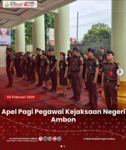Senin, 3 Februari 2025 – Kepala Seksi Perdata dan Tata Usaha Negara Kejaksaan Negeri Ambon Bapak Karel Benyto, S.H., M.H. memimpin pelaksaan apel pagi yang diikuti oleh seluruh pegawai Kejaksaan Negeri Ambon.