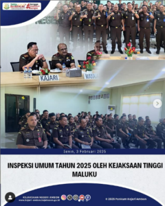 Senin, 3 Februari 2025 – Wakil Kepala Kejaksaan Tinggi Maluku Dr. Jefferdian, S.H., M.H. bersama Asisten Bidang Pengawasan Kejati Maluku Bapak Rio Rizal, S.H., M.H. beserta petugas pemeriksa Kejati Maluku melaksanakan Inspeksi Umum pada setiap bidang di Kejaksaan Negeri Ambon. Kegiatan Inspeksi meliputi kegiatan audit, review, pemantauan serta evaluasi dalam rangka meningkatkan efisiensi dan efektivitas