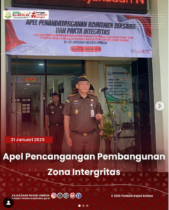 Jum’at 31 Januari 2025 – Kepala Kejaksaan Negeri Ambon Dr. Adhryansah, S.H., M.H. memimpin Apel Penandatanganan Komitmen Bersama dan Pakta Integritas Dalam Rangka Pembangunan Zona Integritas Menuju Wilayah Bebas dari Korupsi dan Wilayah Birokrasi Bersih dan Melayani. Kegiatan berlangsung di halaman Kantor Kejaksaan Negeri Ambon pada jam 09.00 WIT – Selesai.