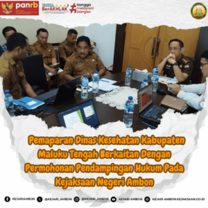 Pada hari Senin, tanggal 05 Agustus 2024, bertempat di ruang Rapat Kepala Kejaksaan Negeri Ambon telah dilaksanakan kegiatan pemaparan dari Dinas Kesehatan Kabupaten Maluku Tengah berkaitan dengan permohonan Pendampingan Hukum dari Dinas Kesehatan Kabupaten Maluku Tengah. Kegiatan tersebut dihadiri oleh Kepala Kejaksaan Negeri Ambon, Kepala Dinas Kesehatan Kabupaten Maluku Tengah, Jaksa Pengacara Negara pada Kejaksaan
