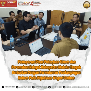 Pada hari Senin, tanggal 05 Agustus 2024, bertempat di ruang Rapat Kepala Kejaksaan Negeri Ambon telah dilaksanakan kegiatan pemaparan dari Dinas Pekerjaan Umum dan Perumahan Rakyat Kabupaten Maluku Tengah berkaitan dengan permohonan Pendampingan Hukum dari Dinas Pekerjaan Umum dan Perumahan Rakyat Kabupaten Maluku Tengah. Kegiatan tersebut dihadiri oleh Kepala Kejaksaan Negeri Ambon, Kepala Dinas Pekerjaan