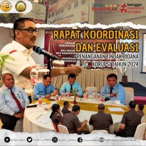 Kepala Kejaksaan Negeri Ambon Bapak Adhryansah, S.H., M.H. Mengikuti Kegiatan Rapat Koordinasi dan Evaluasi Penanganan Tindak Pidana Korupsi Tahun 2024. Kegiatan berlangsung di Hotel Amaris, Jalan diponegoro Kota Ambon pada pukul 17.30 – Selesai.