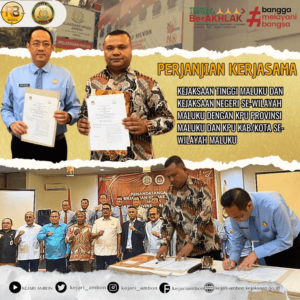 Pada hari Rabu, tanggal 7 Agustus 2024, telah dilaksanakan Perjanjian Kerjasama antara Kejaksaan Tinggi Maluku dan Kejaksaan Negeri se-wilayah Maluku dengan KPU Provinsi Maluku dan KPU KAB/KOTA se-wilayah Maluku.