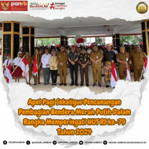 Senin,05 Agustus 2024Kepala Kejaksaan Negeri Ambon yang diwakili Kepala Seksi Intelijen Bapak Ali Toatubun, S.H. MenghadiriAcara Apel Pagi Sekaligus Pencanangan Pembagian Bendera Merah Putih Dalam Rangka Memperingati HUT RI ke-79 Tahun 2024. Acara tersebut dipimpin langsung oleh PJ Walikota Ambon Dominggus, N. KAYA S.Sos. M.Si. Acara berlangsung di Tribun Lapangan Merdeka Ambon, pada pukul 08.00